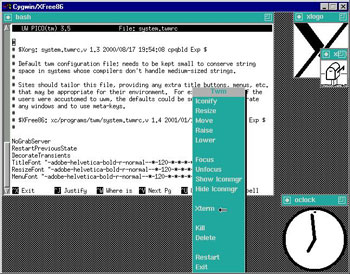 I decided to try runnin X windows on top of Cygwin. I got it running (with the default window manager, twm). I also downloaded a few other window managers, but running X programs on top of Cygwin is fairly slow on my Win98 box. It was a fun experiment, but for me Cygwin is better utilized as at the command line. But here's a screenshot for your pleasure.