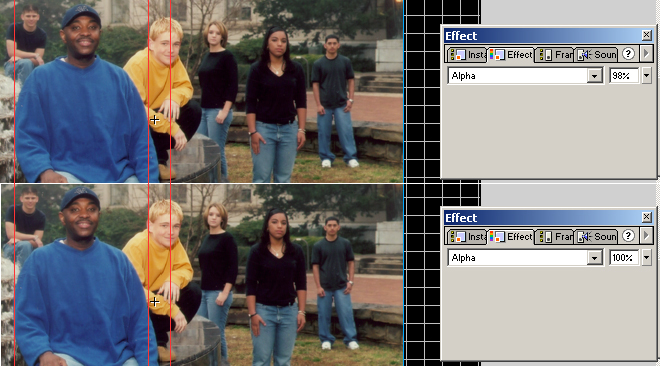 Well, it certainly looks like one. And I haven't found anyone else documenting it, so I thought I might. You'll have to click the thumbnail above to notice. I've added some red lines to point out the glitch, as it's not obvious in a still. Compare both pictures at the line. What you'll notice is that the image, from the rightmost red line leftward, gets shifted about one pixel, just enough to make it seem to jog to the left. What causes it? Moving the alpha setting from 99 per cent to 100 per cent! You can really notice it in the yellow shirted kid's head and the arm of the kid in the top-left corner. It doesn't happen on every image, but I have found it on more than one.